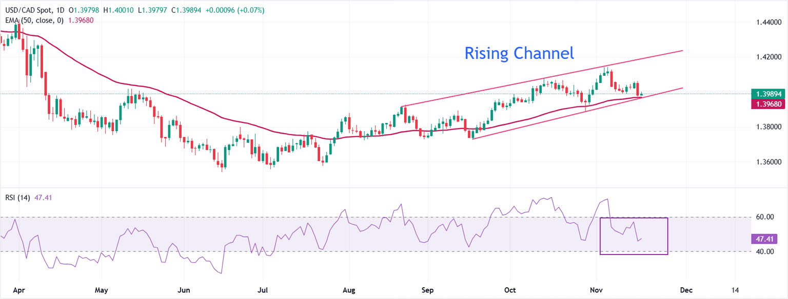 El USD/CAD corrige cerca de la Media Móvil Exponencial (EMA) de 50 días, que cotiza alrededor de 1.3968. La tendencia general del par sigue siendo alcista ya que opera dentro de la formación del canal ascendente.
