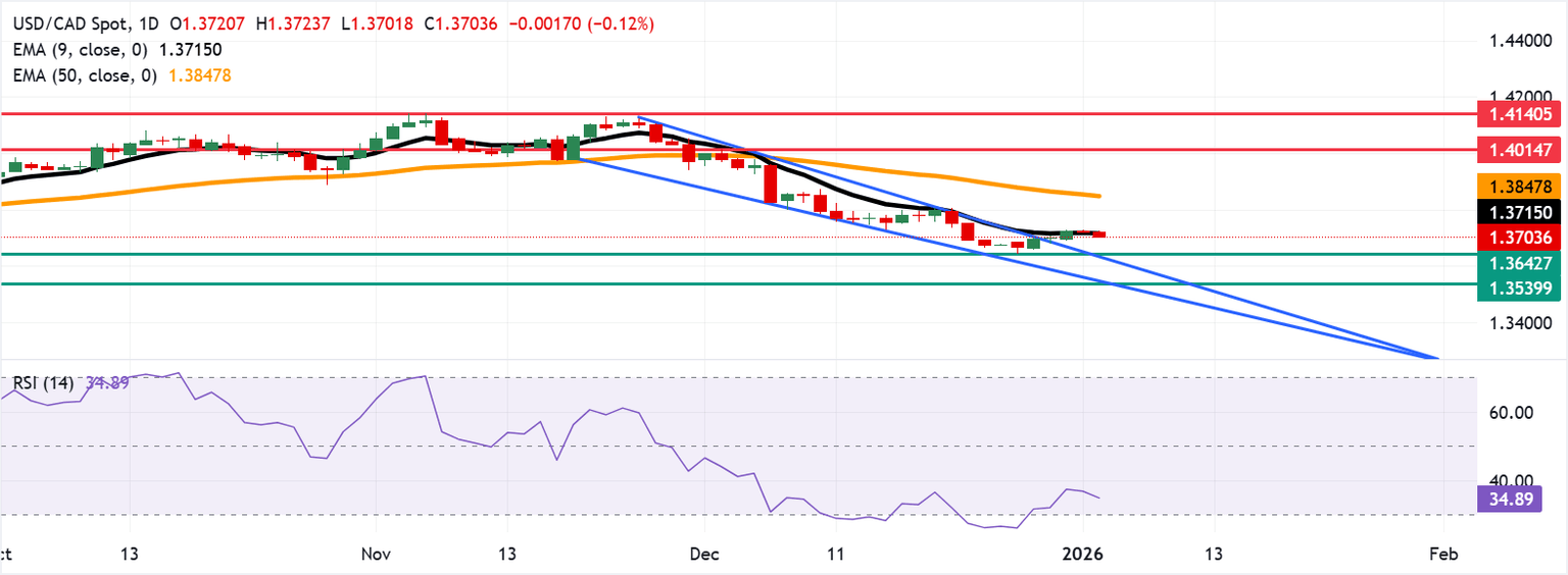 USD/CAD Previsión del Precio: Se mantiene en torno a 1.3700 por debajo de la EMA de nueve días