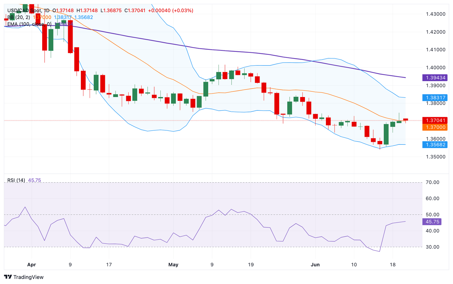 USD/CAD Previsión del Precio: Se mantiene limitado por debajo de la EMA de 100 días, la tendencia bajista prevalece cerca de 1.3700