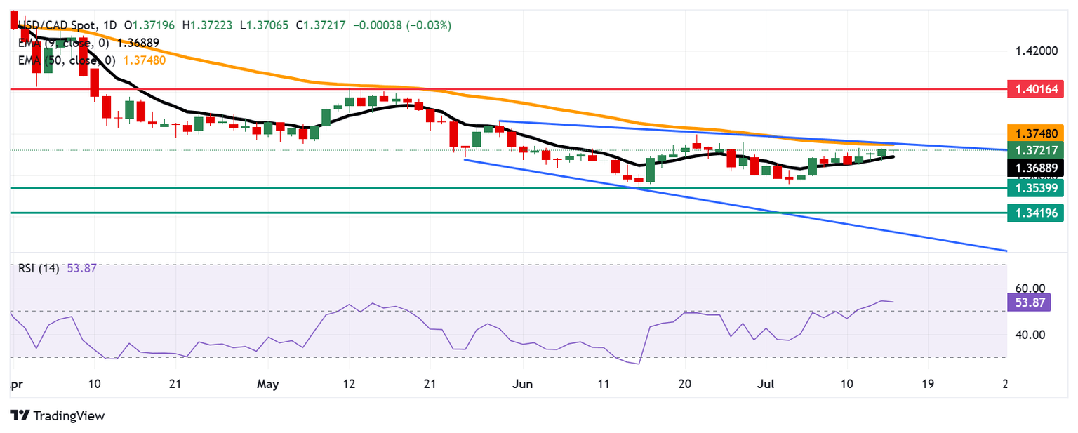 USD/CAD Previsión del Precio: Se mantiene por encima de 1.3700 cerca de la EMA de 50 días