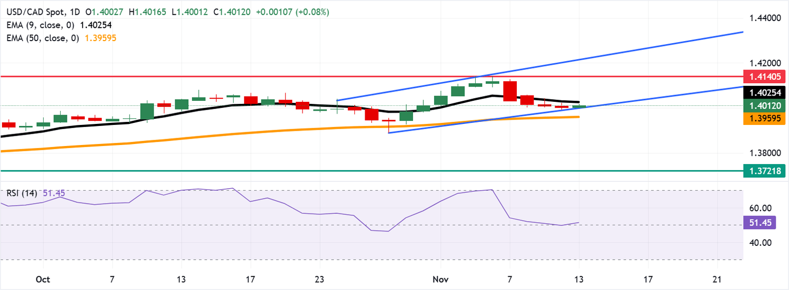 El USD/CAD avanza tras cuatro días de pérdidas, cotizando alrededor de 1.4010 durante las horas asiáticas del jueves. El análisis técnico del gráfico diario indica un sesgo alcista predominante, con el par permaneciendo dentro del patrón de canal ascendente.