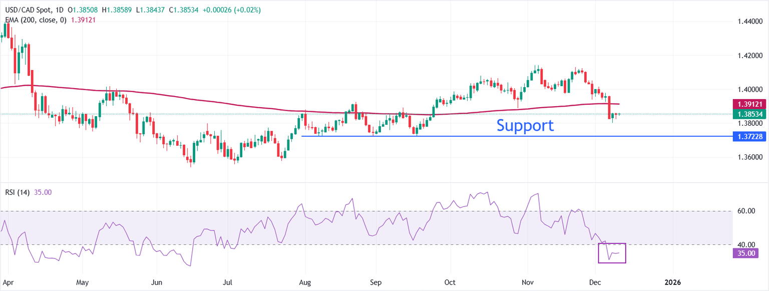 El USD/CAD cotiza cerca de 1.3850 durante la sesión de negociación europea del miércoles. El par se ha mantenido por debajo de la media móvil exponencial (EMA) de 200 días en 1.3912, manteniendo a los bajistas en control. La EMA de 200 días se ha aplanado tras un anterior ascenso, lo que indica una disminución en la fuerza de la tendencia. La incapacidad para recuperar la EMA de 200 días continuaría presionando a la baja.