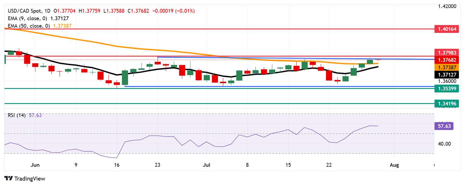 - El USD/CAD prueba el límite superior del rectángulo alrededor de 1.3780.
