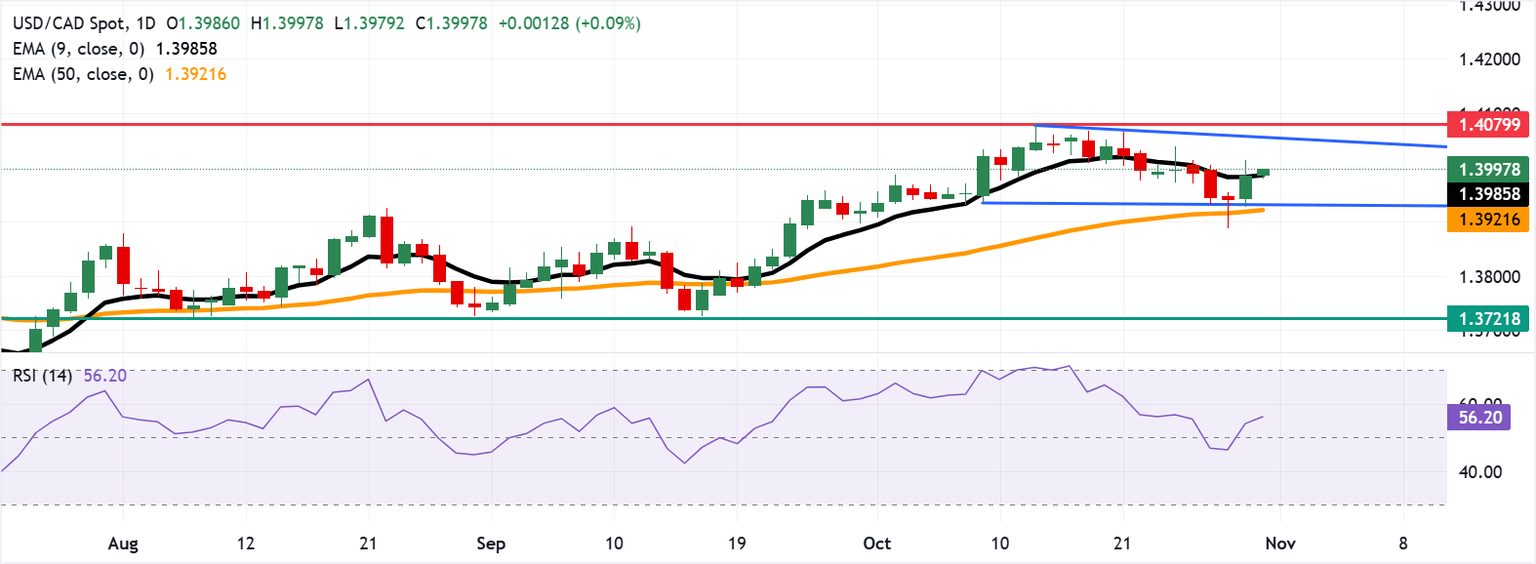 USD/CAD Pronóstico del Precio: Probando la barrera de 1.4000 tras romper por encima de la EMA de nueve días