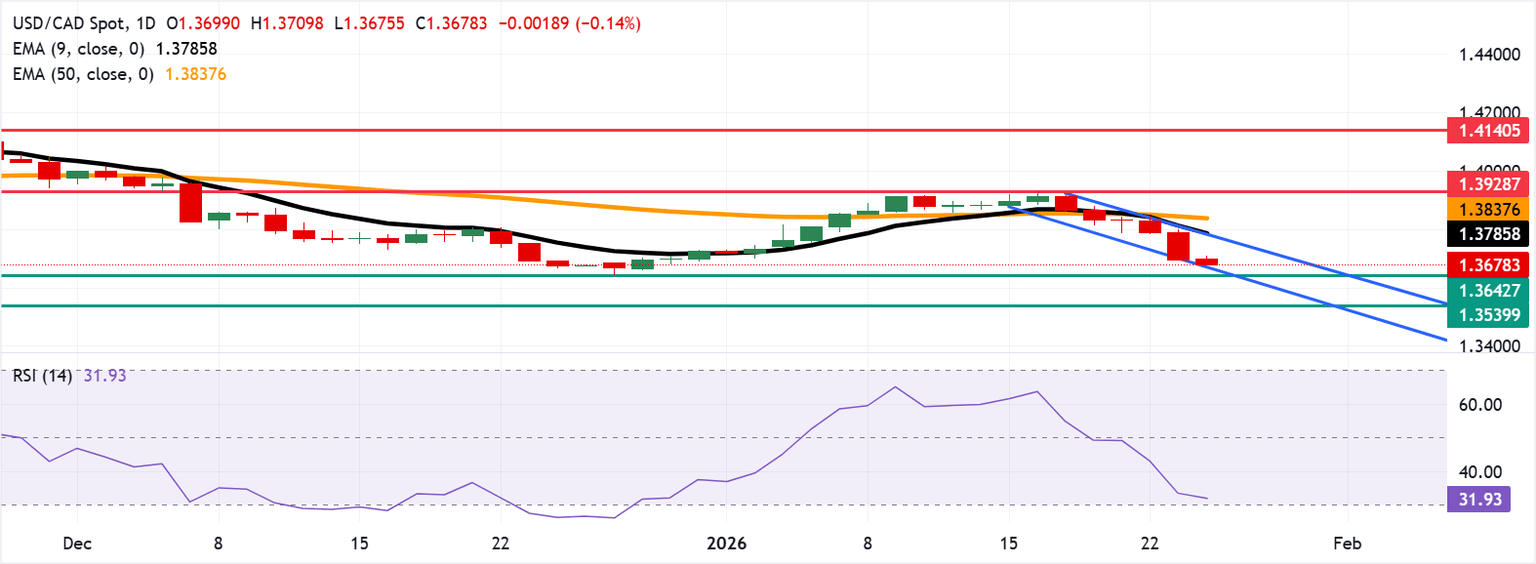 El USD/CAD extiende su racha de pérdidas por sexta sesión consecutiva, negociándose alrededor de 1.3680 durante las horas asiáticas del lunes. El análisis técnico del gráfico diario muestra que el par desciende dentro de un patrón de canal descendente recién formado, sugiriendo un sesgo bajista persistente. El Índice de Fuerza Relativa (RSI) de 14 días está en 32 (cerca de sobreventa) y en descenso, confirmando el debilitamiento del impulso.