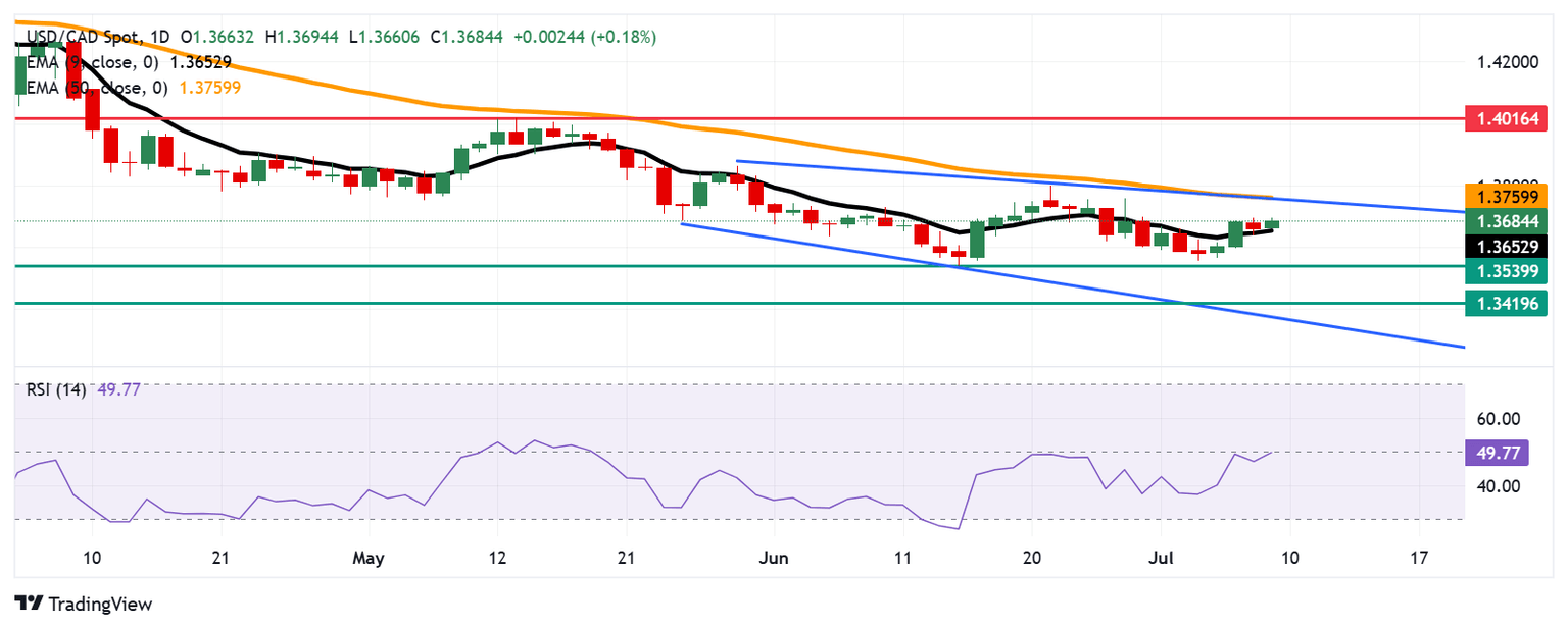 El Índice de Fuerza Relativa (RSI) de 14 días se mantiene alrededor del nivel 50, indicando un sesgo neutral. Un movimiento adicional ofrecerá un sentimiento direccional claro. Sin embargo, el par USD/CAD se mantiene por encima de la EMA de nueve días, indicando que el impulso a corto plazo se está fortaleciendo.