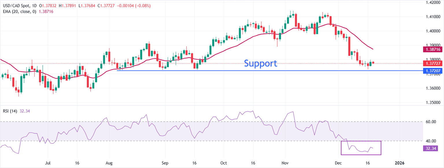 El USD/CAD baja a cerca de 1.3775 el jueves. El par se mantiene por debajo de la media móvil exponencial (EMA) de 20 días en 1.3872, manteniendo a los bajistas en control. La EMA de 20 días ha girado durante varias sesiones y continúa limitando los rebotes.