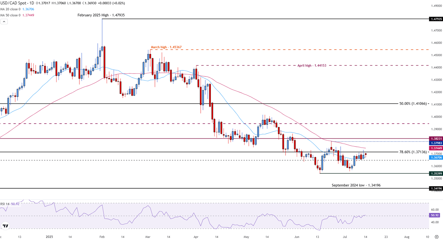 El par está probando la media móvil simple (SMA) de 20 días en 1.3670, mientras que la resistencia se mantiene firme en la SMA de 50 días cerca de 1.3745. Más allá de eso, los próximos objetivos al alza se encuentran en el máximo de junio de 1.3798 y el nivel psicológico de 1.3800.