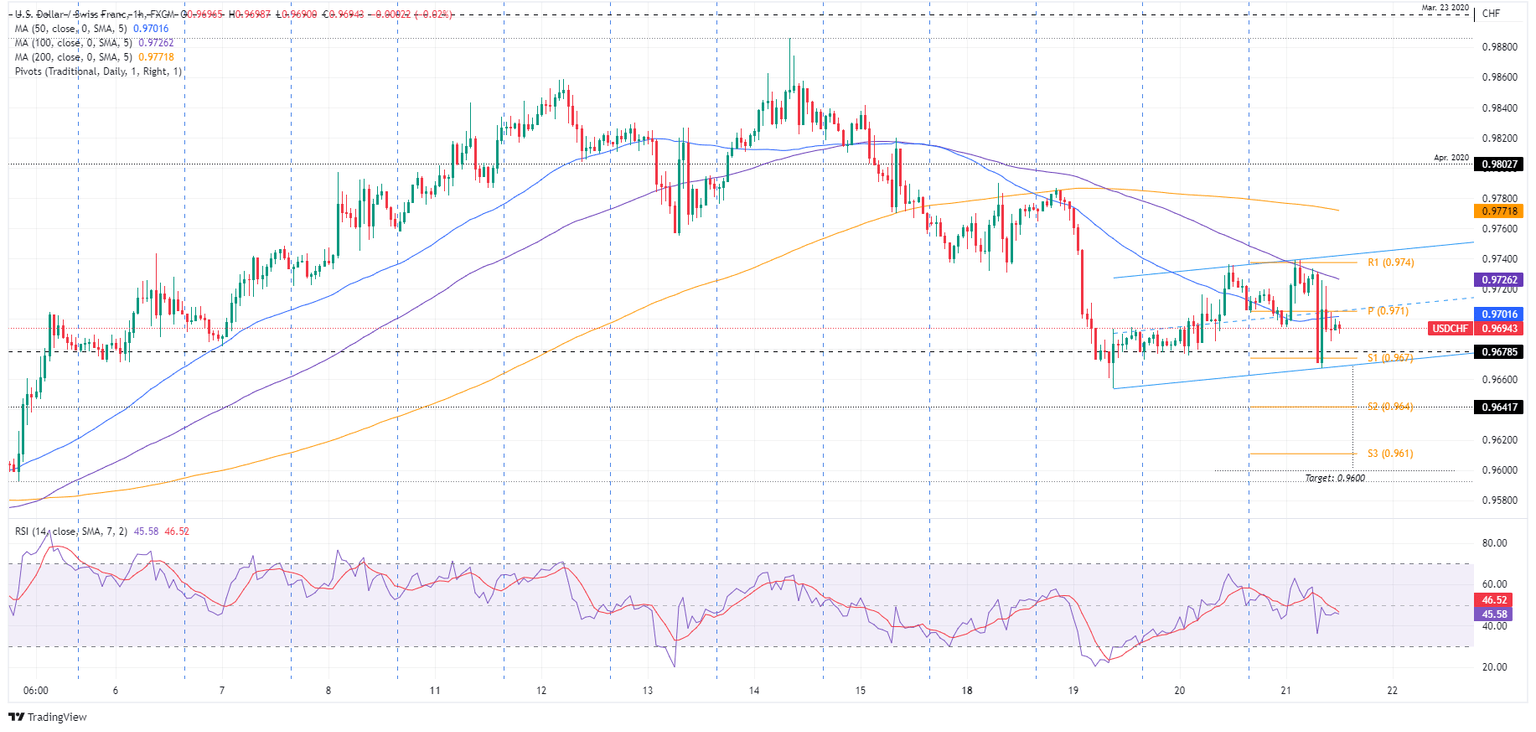 - Análisis del precio del USD/CHF: Bajista-neutral, y si los vendedores recuperan 0.9670, la mayor caerá hacia 0.9600.