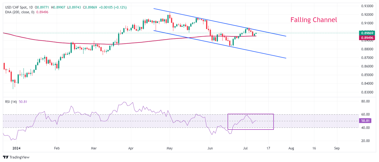 El USD/CHF se negocia en un patrón de gráfico de Canal Descendente en un marco temporal diario en el que cada retroceso es considerado una oportunidad de venta por los participantes del mercado. El activo del Franco suizo encuentra soporte cerca de la media móvil exponencial (EMA) de 200 días alrededor de 0.8950, lo que sugiere que una tendencia alcista a largo plazo está intacta.