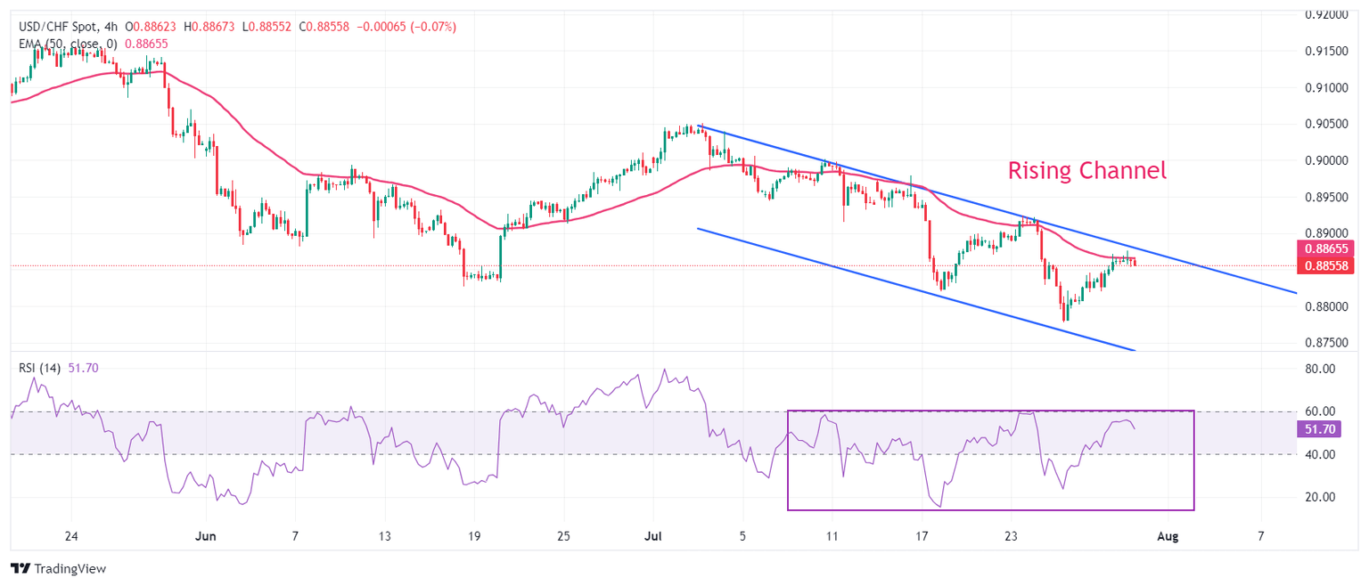 El USD/CHF se negocia en una formación de Canal Descendente, en un marco de tiempo de cuatro horas, en el que cada movimiento de retroceso es considerado una oportunidad de venta por los participantes del mercado. La media móvil exponencial (EMA) de 50 períodos cerca de 0.8870 sigue actuando como una barrera importante para los alcistas del Dólar estadounidense.