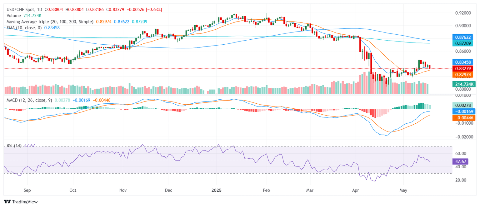 El par USD/CHF está cotizando un 0.5% más bajo alrededor de 0.8330 durante las horas de negociación en América del Norte el lunes, reflejando una fuerte caída en el sentimiento del Dólar estadounidense tras la rebaja de Moody's a la calificación crediticia a largo plazo de los Estados Unidos de AAA a AA1. Esto marca un golpe significativo a la estabilidad percibida del Dólar estadounidense, presionando aún más al Dólar en medio de desafíos fiscales en curso.