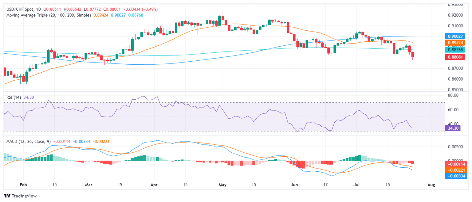 En la sesión de negociación del jueves, el USD/CHF continuó extendiendo su caída, cerrando con una baja del 0.48% en torno a 0.8800 a pesar de las sólidas cifras del PIB publicadas por Estados Unidos. Esto resultó en una pérdida total de más del 2% para el par durante las últimas dos sesiones.