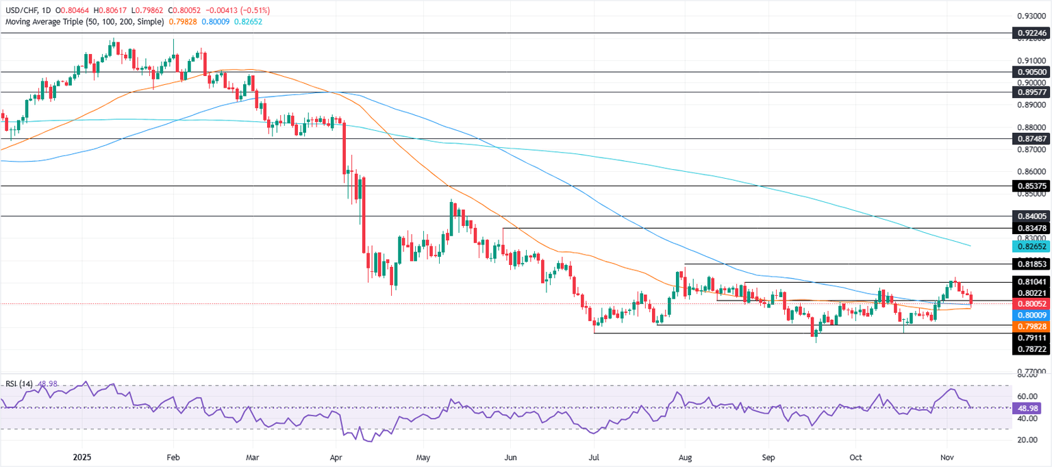 El USD/CHF se sumerge por cuarto día consecutivo, cotizando alrededor de 0.8000 después de perder un 0.55% a finales del martes, durante la sesión norteamericana. Datos económicos de EE.UU. peores de lo esperado y una reducción de aranceles a Suiza impulsaron al Franco suizo durante la sesión de negociación.