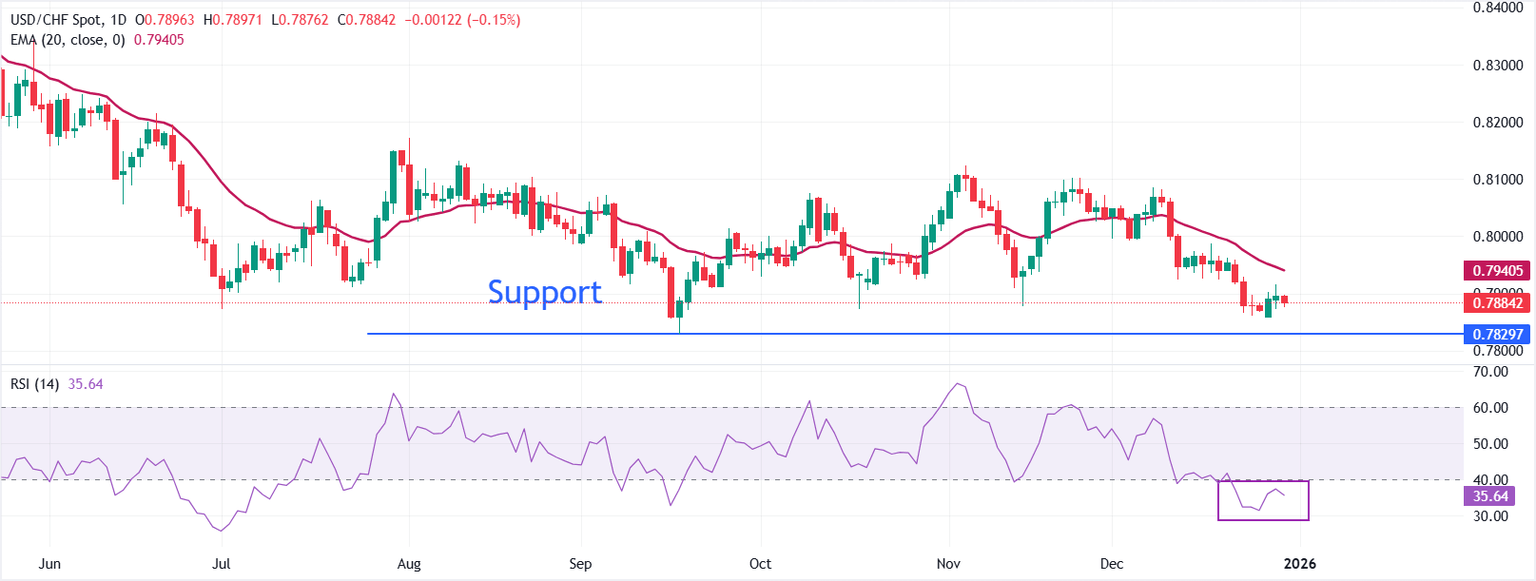 El par USD/CHF cotiza un 0.12% a la baja cerca de 0.7880 durante la sesión de negociación europea del martes. El par Franco suizo enfrenta una ligera presión de venta mientras el Dólar estadounidense (USD) opera con cautela a la espera de la publicación de las minutas de la reunión del Comité Federal de Mercado Abierto (FOMC) de diciembre en la última sesión de Nueva York.