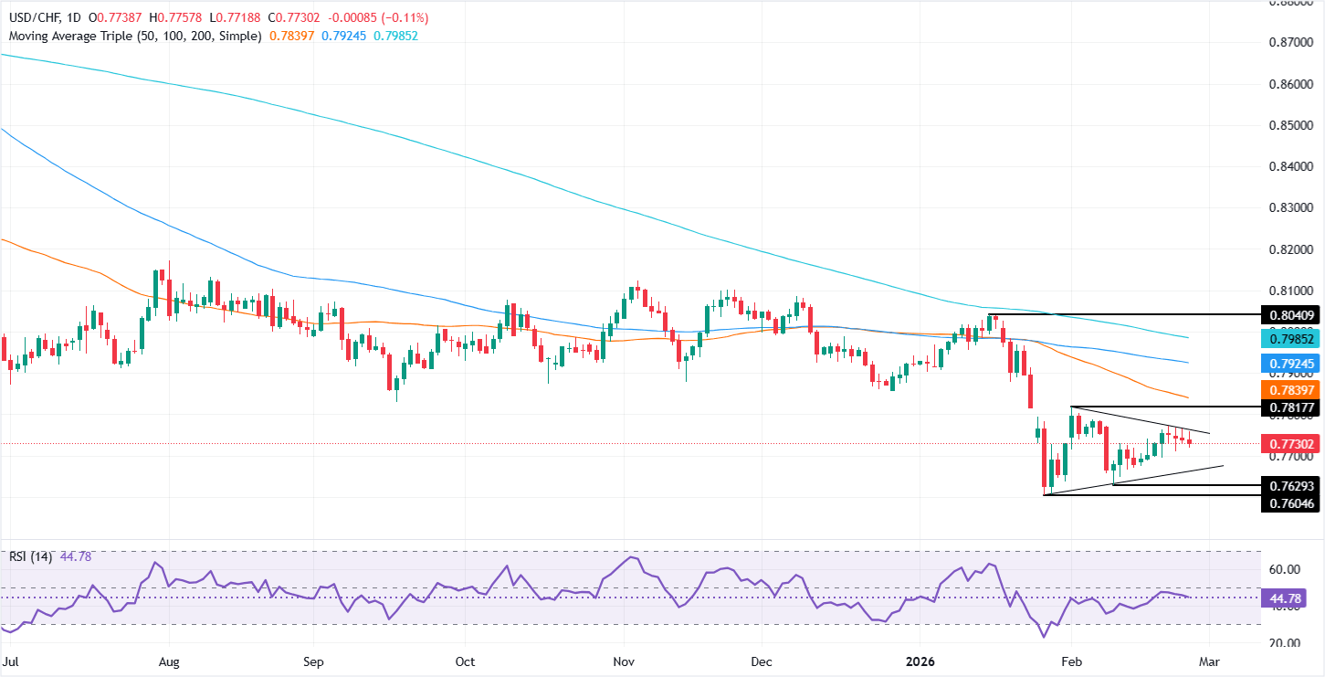 El USD/CHF extiende sus pérdidas por cuarto día de negociación consecutivo, bajando un 0.14%, sin embargo, se mantiene confinado en el rango de 0.7718-0.7757 durante los últimos tres días. Al momento de escribir, se intercambia a 0.7729, por encima de la Media Móvil Simple (SMA) de 20 días en 0.7726.