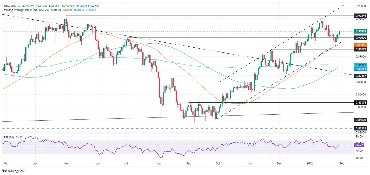 La tendencia alcista del USD/CHF se mantiene intacta, aunque el par brevemente cayó por debajo de la media móvil simple (SMA) de 50 días de 0.8963 el martes antes de recuperar la cifra de 0.9000.