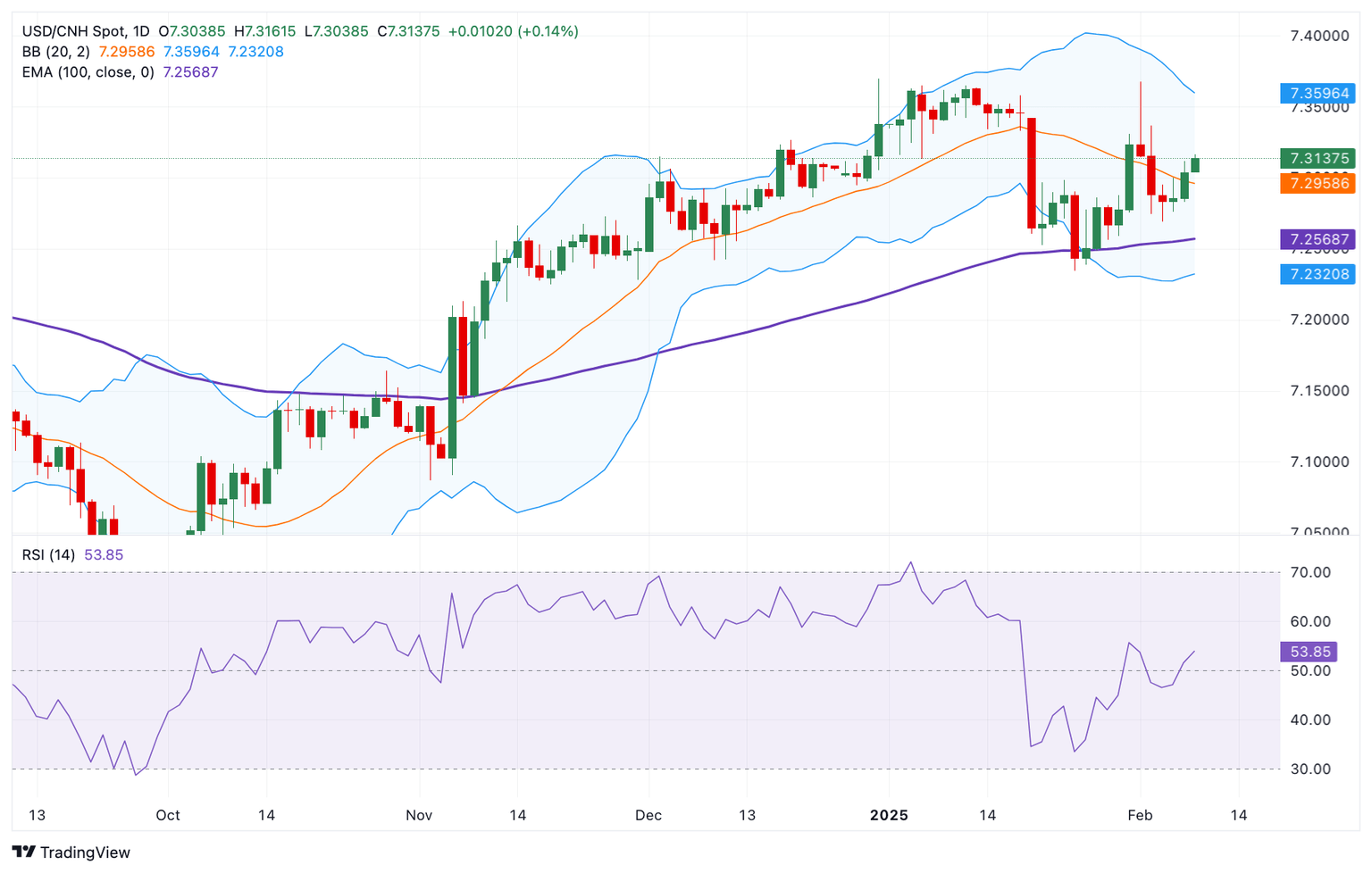 Según el gráfico diario, la perspectiva alcista del USD/CNH se mantiene intacta, con el precio manteniéndose por encima de la media móvil exponencial (EMA) de 100 periodos clave. El impulso alcista está respaldado por el Índice de Fuerza Relativa (RSI), que se encuentra por encima de la línea media cerca de 55.00, sugiriendo que el camino de menor resistencia es al alza.