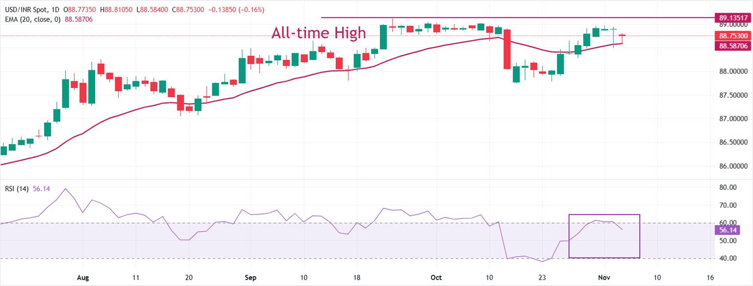 Análisis Técnico: El USD/INR se mantiene por encima de la EMA de 20 días