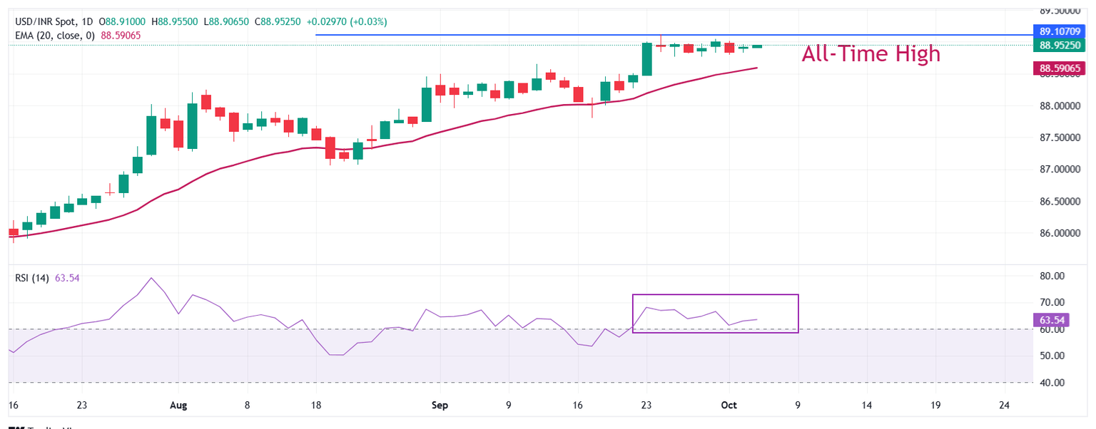 La Rupia india (INR) abre en una nota plana alrededor de 88.90 frente al Dólar estadounidense (USD) el lunes. El par USD/INR se mantiene en general firme, ya que todavía está cerca de su máximo histórico de 89.12 registrado el 24 de septiembre.