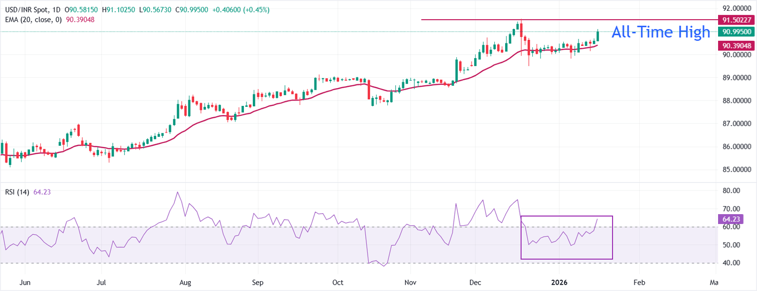 Análisis Técnico: El USD/INR apunta a revisitar el máximo histórico cerca de 91.50