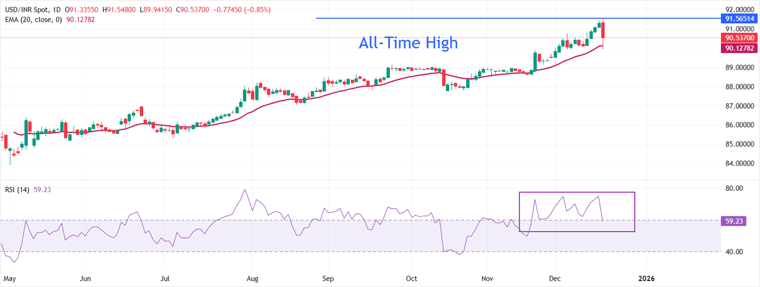 Las condiciones de tendencia se mantienen firmes, aunque el impulso se ha moderado a medida que el RSI retrocedió de los 70 a 59.23. Los retrocesos se mantendrían bajo control mientras el USD/INR defienda la base de la media móvil, con una zona de soporte a través del grupo de la EMA de 20 días en 89.9556–89.8364. Un cierre diario por debajo de esa área inclinaría el sesgo hacia la consolidación, mientras que mantener las ofertas por encima de ella dejaría espacio para una extensión al alza.