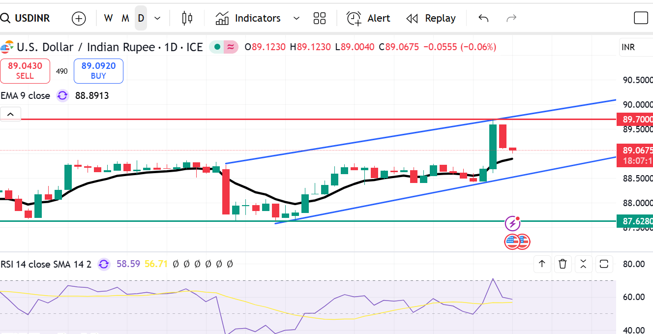 El USD/INR cotiza alrededor de 89.10 durante las horas asiáticas del martes, con el análisis técnico sugiriendo un sesgo alcista a medida que el par se mantiene dentro del patrón de canal ascendente. Además, el Índice de Fuerza Relativa (RSI) de 14 días se mantiene por encima del nivel 50, fortaleciendo el sesgo alcista.
