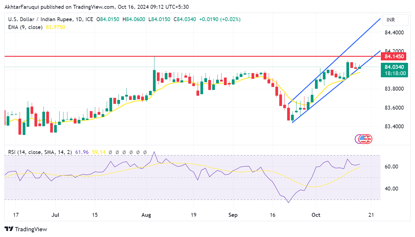El par USD/INR ronda la región de 84.00 el miércoles. El análisis del gráfico diario muestra que el par está probando el límite inferior de un patrón de canal ascendente. Si rompe por debajo de este canal, podría indicar un posible cambio del sentimiento alcista actual. Sin embargo, el Índice de Fuerza Relativa (RSI) de 14 días se mantiene por encima del nivel de 50, lo que sugiere que el impulso al alza aún está intacto.