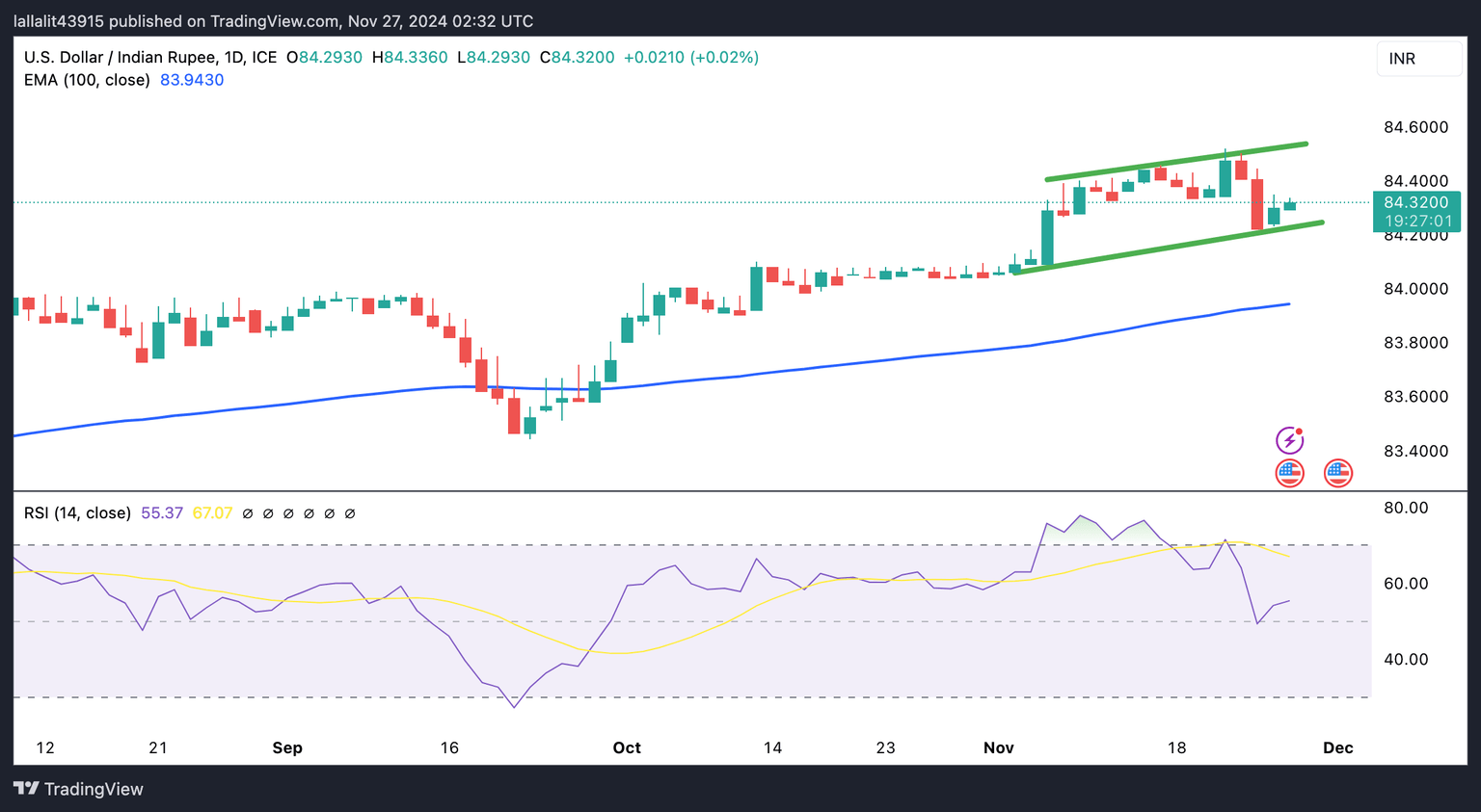 La Rupia india cotiza más débil en el día. El par USD/INR mantiene la vibra alcista dentro de un canal de tendencia ascendente en el gráfico diario, con el precio manteniéndose por encima de la media móvil exponencial (EMA) de 100 días. El impulso alcista está respaldado por el Índice de Fuerza Relativa (RSI) de 14 días, que se encuentra por encima de la línea media cerca de 55,30, lo que sugiere que un mayor alza parece favorable.