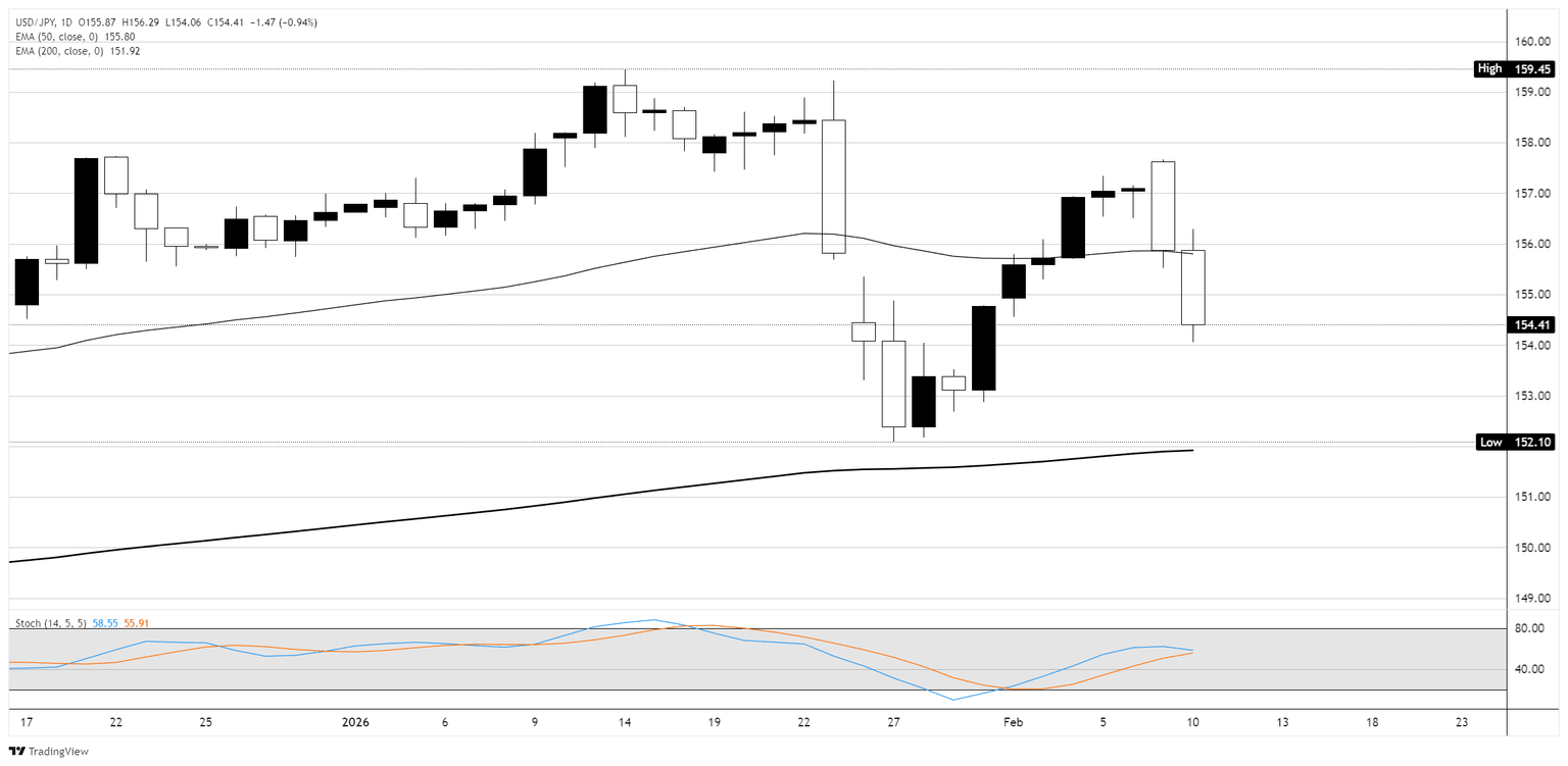 El USD/JPY se está negociando en una estructura volátil y lateral en el gráfico diario, oscilando entre el máximo de enero cerca de 159.450 y el mínimo de finales de enero en 152.100. El precio cerró el lunes en 154.410, cayendo bruscamente 1.47 yenes (0.94%) después de un gap inicial al alza tras la aplastante victoria electoral de la primera ministra Takaichi, que fue recibida con una intervención verbal del ministro de Finanzas Katayama y el principal funcionario de divisas de Japón, Mimura, ambos señalando su disposición a actuar sobre la volatilidad del yen.