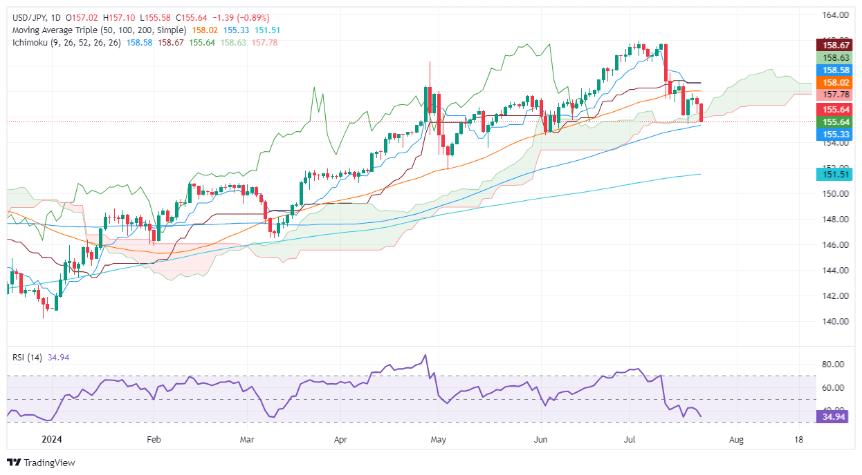 El USD/JPY se desploma más de un 0.85% y cae por debajo de la Nube de Ichimoku (Kumo) por primera vez desde el 15 de enero. Este es un hito importante aún pendiente de ser confirmado por un cierre diario por debajo de 155.90. Al momento de escribir, el par cotiza en 155.65 después de alcanzar un máximo diario de 157.10.