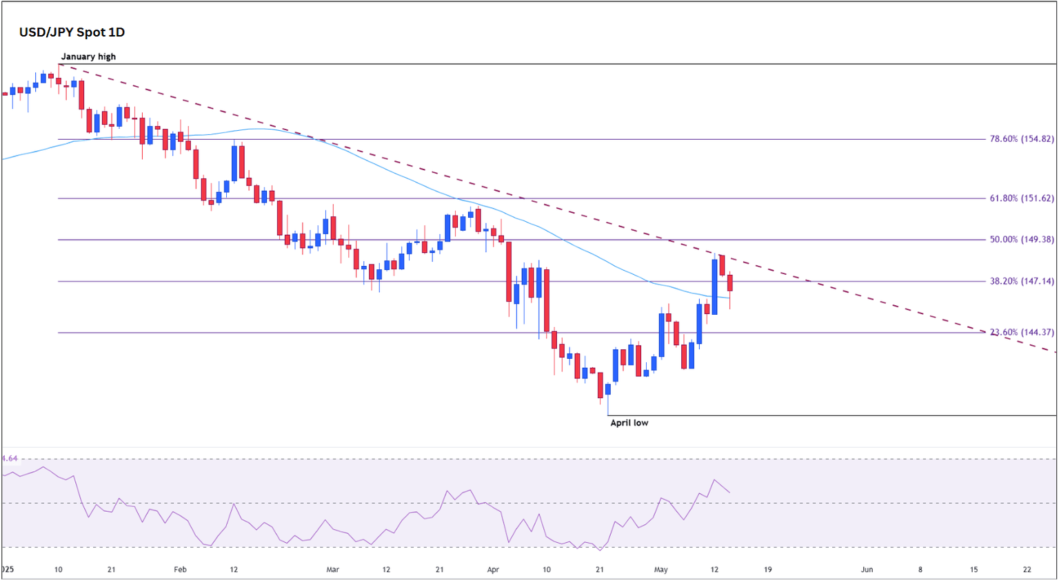 Técnicamente, el USD/JPY se encuentra en una encrucijada crítica. Un breakout confirmado por encima de la media móvil simple (SMA) de 50 días en 146.34 señalaría un renovado impulso alcista, abriendo el camino hacia la resistencia en 147.09—el retroceso de Fibonacci del 38.2% de la caída de enero a abril. Una fortaleza sostenida podría incluso apuntar al nivel psicológico de 150.00, particularmente si los rendimientos de EE.UU. se recuperan o si la divergencia de políticas entre la Fed y el BoJ se amplía.