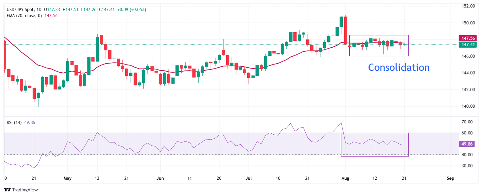 El par USD/JPY se consolida en un rango estrecho alrededor de 147.40 durante la sesión de trading asiática del jueves. El par se mueve lateralmente mientras los inversores esperan el discurso del presidente de la Reserva Federal (Fed), Jerome Powell, el viernes.