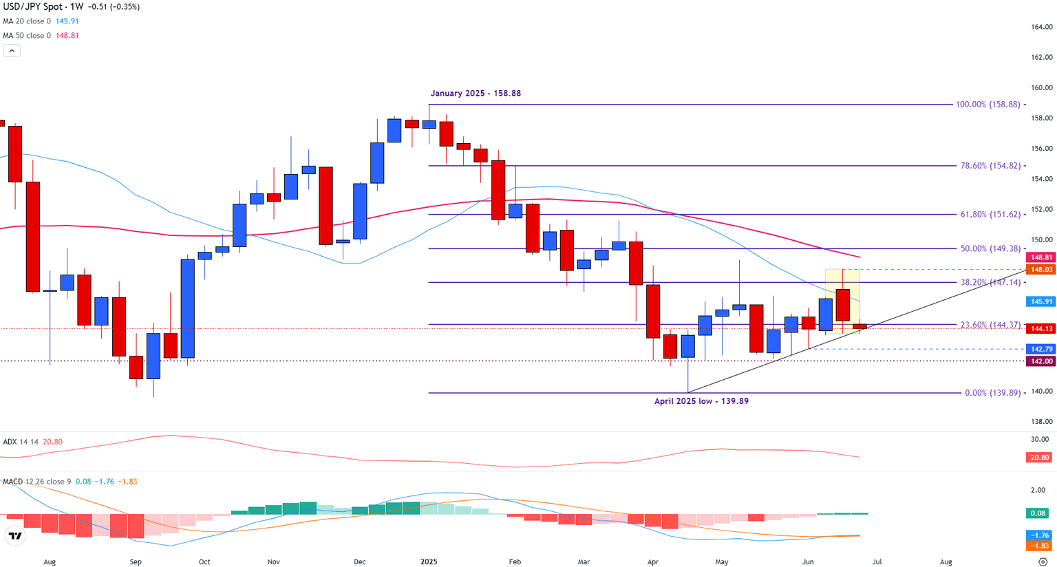 La línea de tendencia de abril sigue siendo una estructura de soporte clave a corto plazo; sin embargo, los indicadores técnicos más amplios sugieren una perspectiva cautelosa. Tanto las SMA de 20 como de 50 semanas continúan inclinándose hacia abajo, reforzando el sesgo bajista a largo plazo a menos que el precio pueda recuperar y mantenerse por encima de la región de 149.00.
