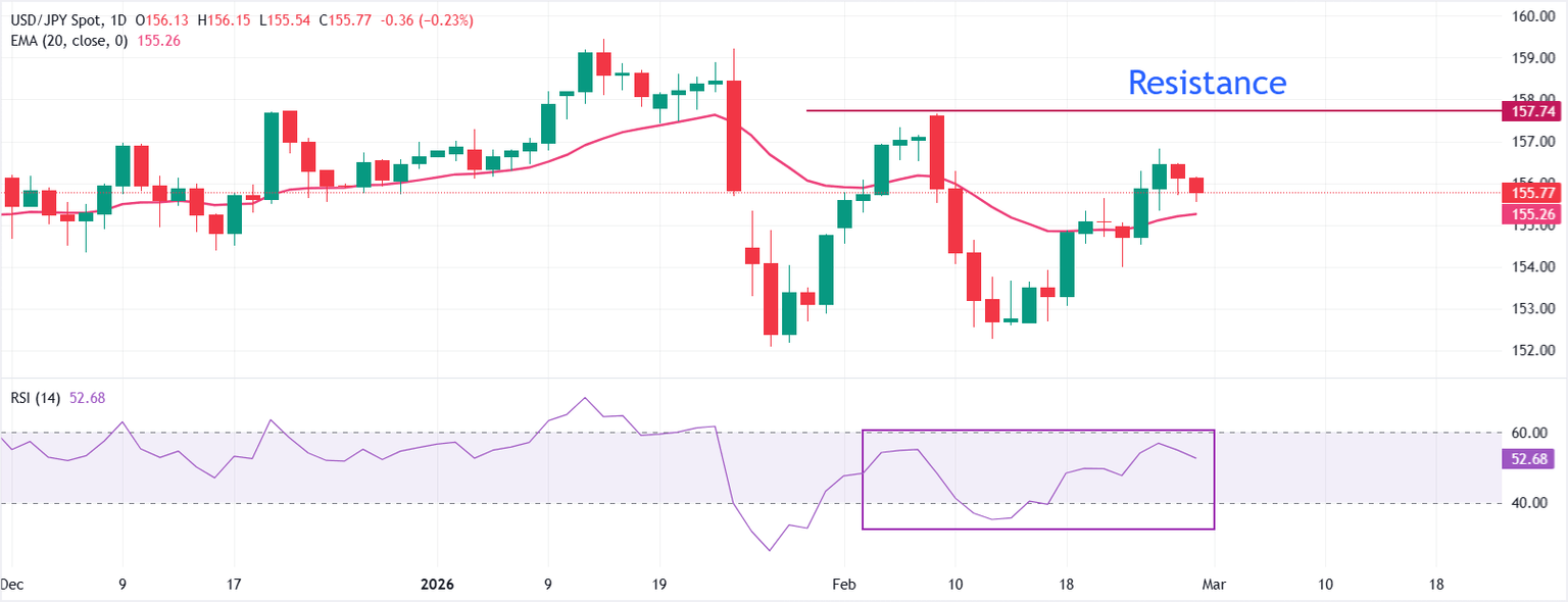 El USD/JPY se negocia a la baja cerca de 155.80 durante el tiempo de prensa. El precio ha retrocedido hacia la media móvil exponencial (EMA) de 20 días, que ahora se sitúa justo por encima de 155.20 y actúa como soporte dinámico. El reciente rebote desde los 152.00 se ha estancado, pero el par aún mantiene un patrón de mínimos más altos.