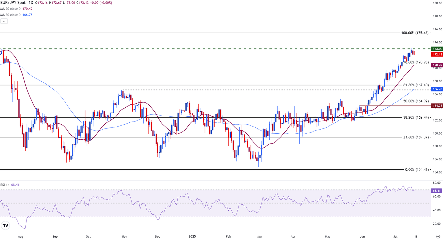 Si los alcistas logran ganar tracción por encima de 173.00, una ruptura del nivel psicológico de 174.00 podría abrir la puerta a una continuación hacia el máximo de julio de 2024 de 175.43.