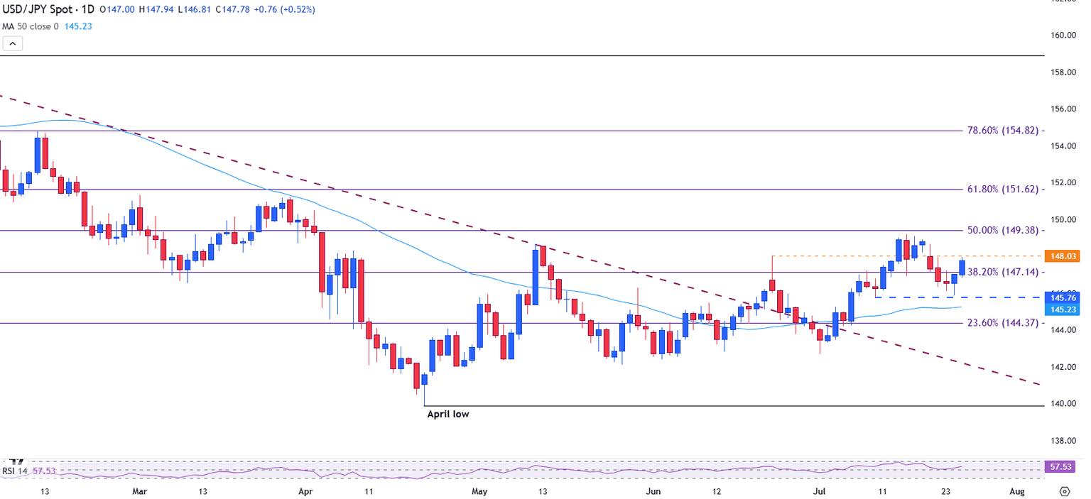 En el momento de escribir, el USD/JPY cotiza por encima de 147.00, con el máximo de junio en 148.03 actuando como resistencia inmediata.