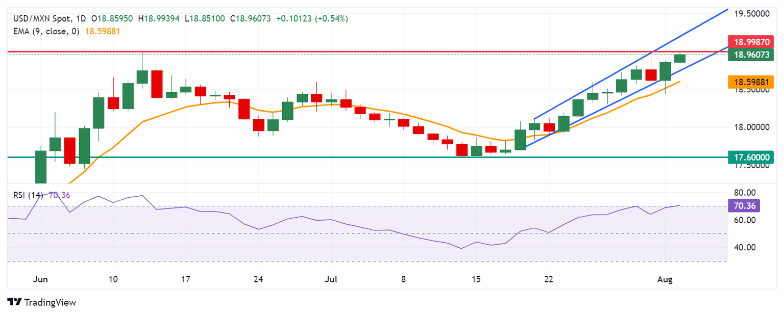 El USD/MXN extiende sus ganancias por segunda sesión, cotizando alrededor de 18.90 durante las horas europeas del viernes. El análisis del gráfico diario indica un sesgo alcista ya que el par se está moviendo hacia arriba dentro de un canal ascendente.