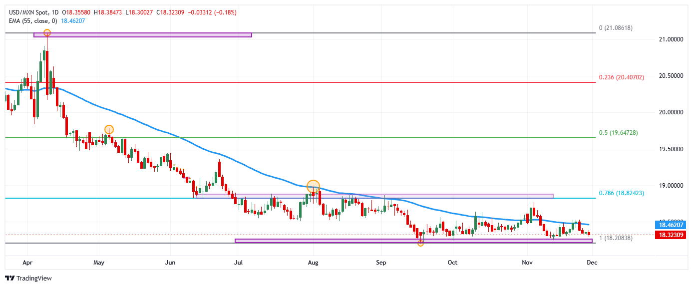 - El USD/MXN retrocede un 0.29% en la última jornada de la semana, visitando mínimos no vistos desde el 20 de noviembre del 18.3003.