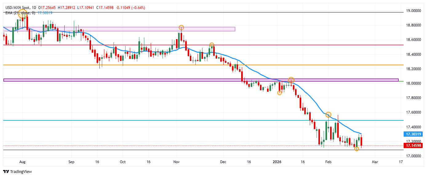 El USD/MXN reaccionó a la baja desde un máximo del día en 17.2891, encontrando vendedores agresivos que arrastraron la paridad a mínimos del 18 de febrero en 17.1094. En estos momentos, el precio del Dólar estadounidense opera sobre 17.1422 frente al Peso mexicano, perdiendo un 0.63% diario.