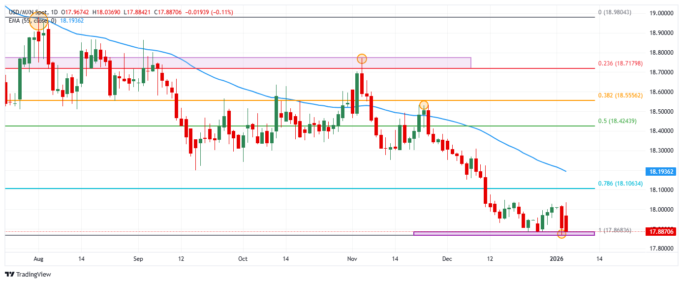 - El USD/MXN retrocede un 0.10% en la primera jornada de la semana, cayendo desde máximos del 19 de diciembre de 2025 en 18.0369.