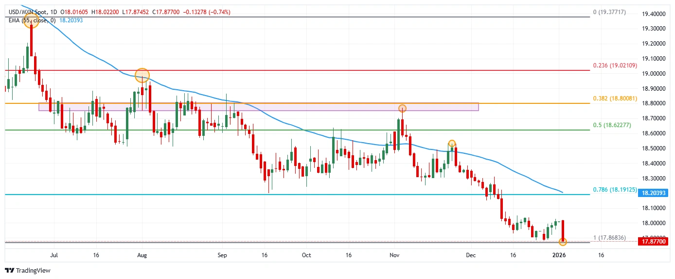 Ante este escenario, el Peso mexicano repunta con fuerza, mientras que el USD/MXN pierde un 0.72% el día de hoy, cotizando actualmente en 17.8805.