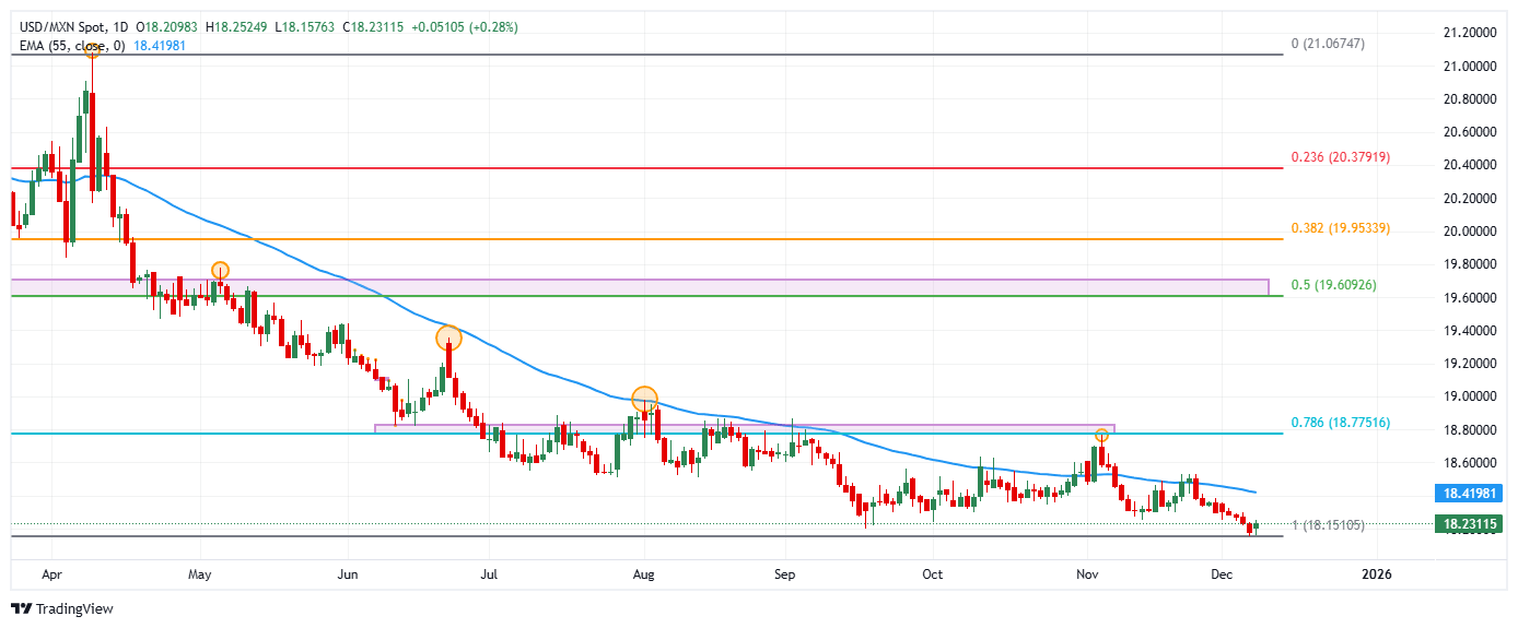 - El USD/MXN sube un 0.32% el día de hoy, consolidándose en máximos del 4 de diciembre en 18.2374.