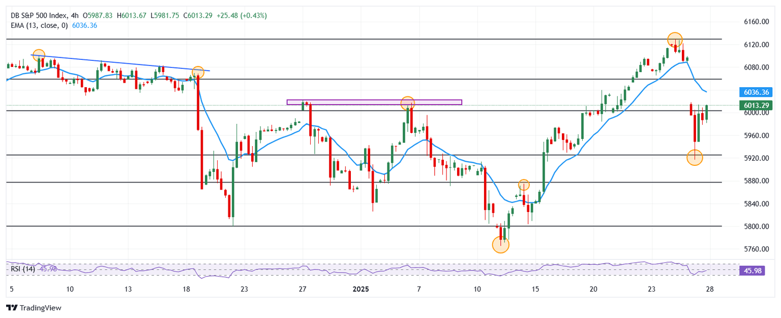 El S&P 500 estableció una resistencia de corto plazo dado por el máximo alcanzado el 24 de enero en 6.129. La zona de soporte clave la observamos en 5.765, punto pivote del 13 de enero.