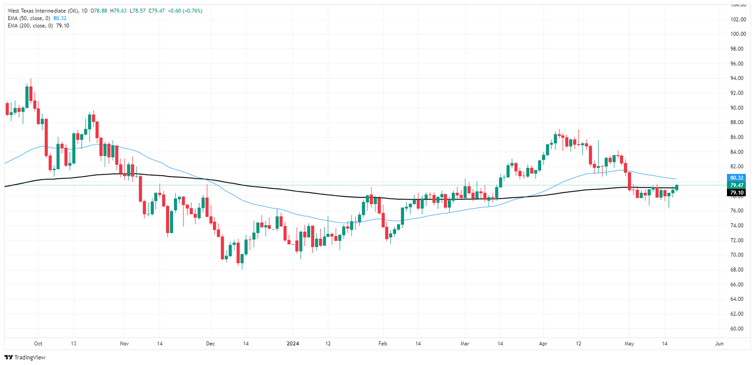El petróleo crudo estadounidense alcanzó un máximo semanal a última hora del viernes, superando la media móvil exponencial (EMA) de 200 días en 79.10$ y llegando a 79.63$ antes del cierre. El WTI se encuentra en una zona de consolidación entre las EMA de 50 y 200 días.