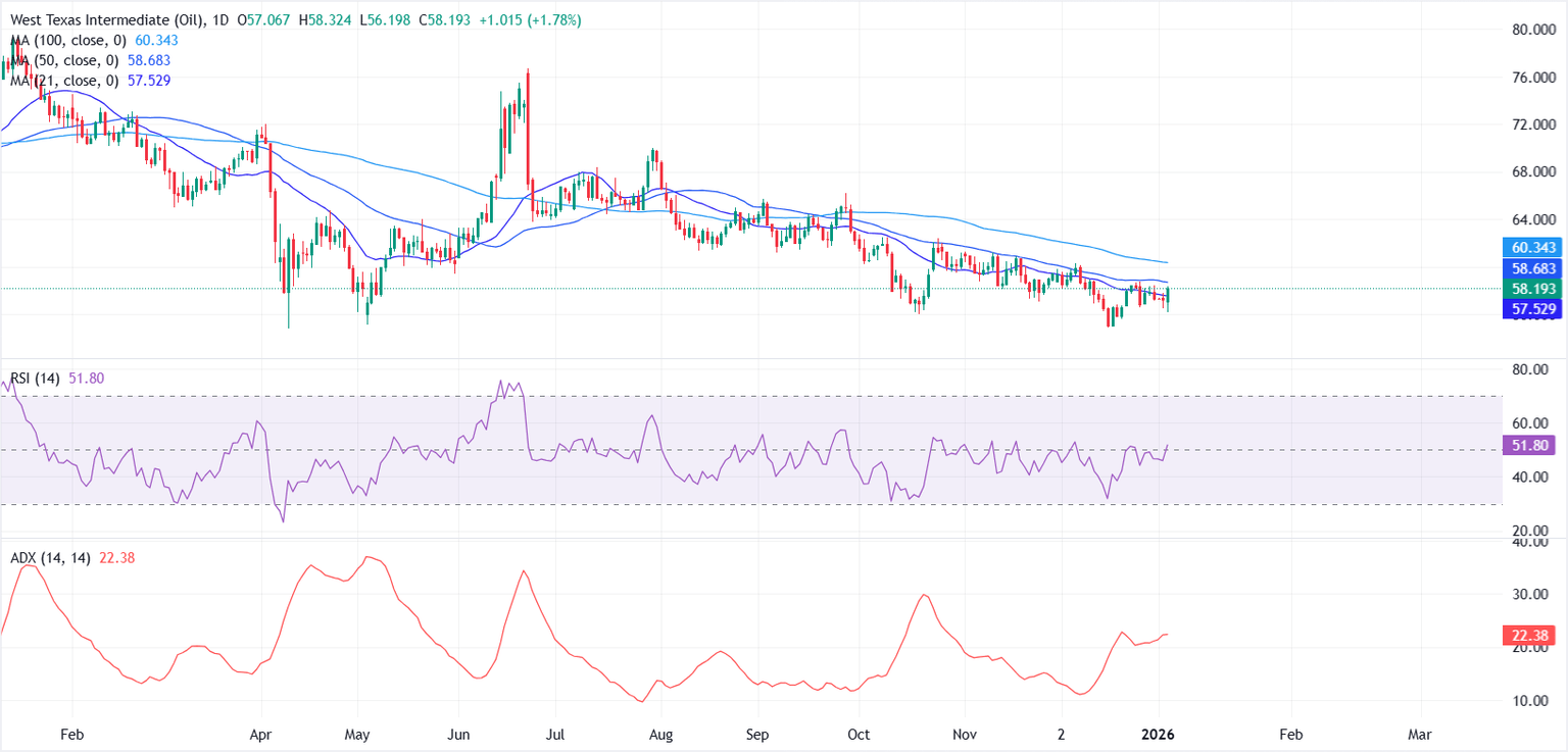 Al momento de escribir, el WTI cotiza alrededor de 58.00$ por barril, recuperándose después de caer a mínimos de más de dos semanas cerca de 56.19$ anteriormente en la sesión europea.
