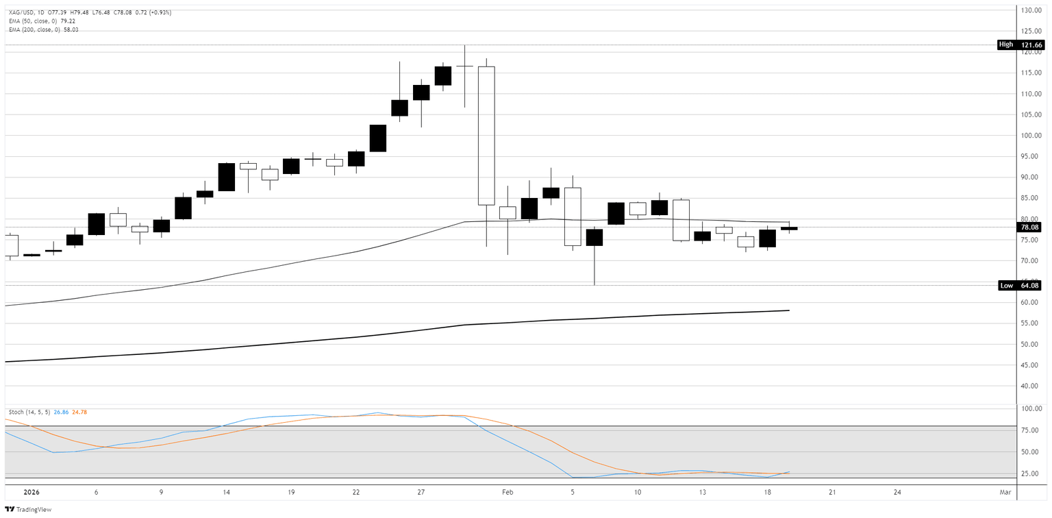 Los precios de la Plata al contado se están negociando justo por debajo de la media móvil exponencial (EMA) de 50 días en 79.22, que está actuando como resistencia a corto plazo, mientras que la EMA de 200 días en 58.03 se sitúa muy por debajo, confirmando que la tendencia alcista más amplia sigue en su lugar, aunque se está debilitando. La recuperación desde el mínimo del 6 de febrero en 64.08 ha sido irregular, con la Plata recuperando aproximadamente la mitad de las pérdidas del pico a finales de enero antes de estancarse en un rango de velas de cuerpo pequeño y doji alrededor de la zona de 75 a 85 en las últimas dos semanas.
