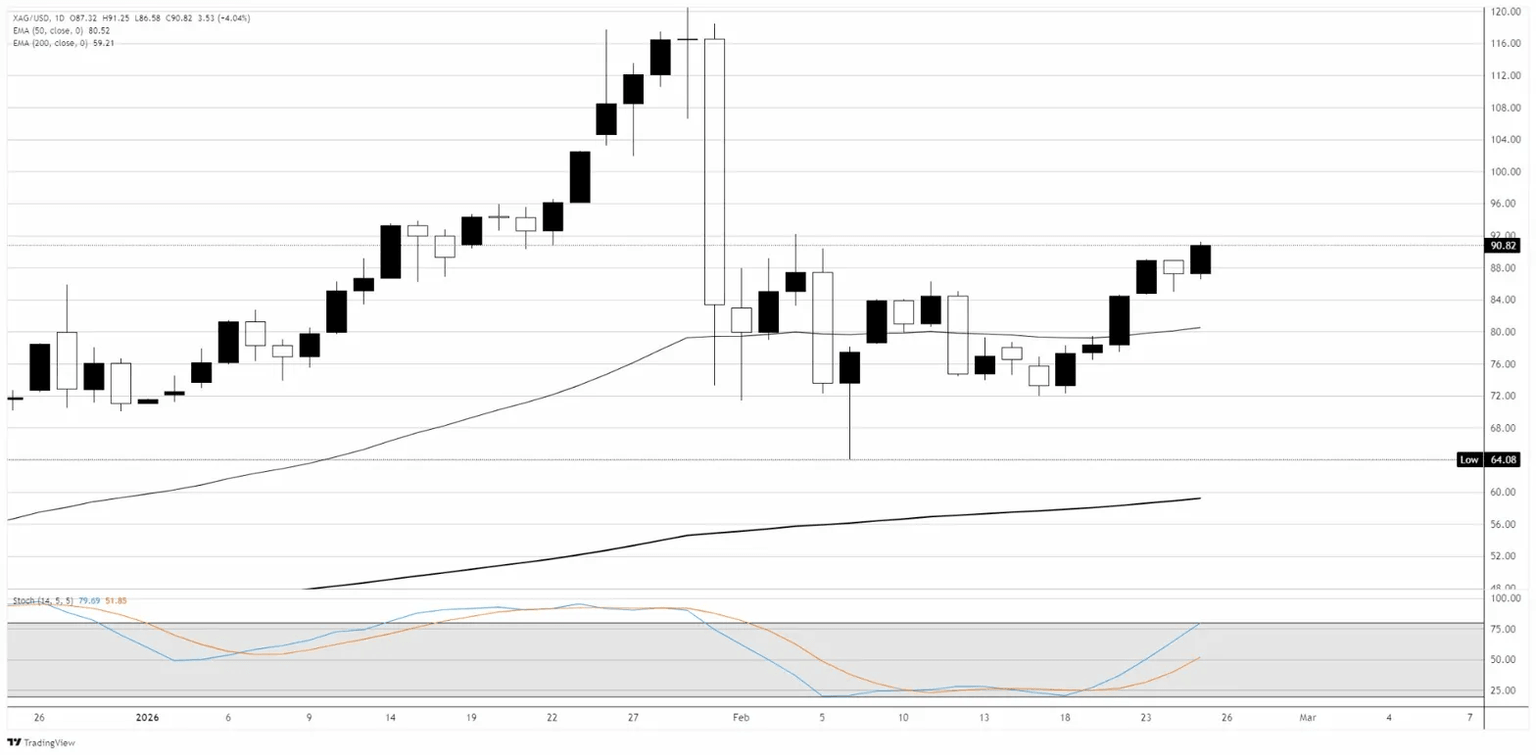 El XAG/USD subió alrededor del 4% el martes, recuperándose bruscamente para cerrar cerca de 91$ en una sesión impulsada por la renovada demanda de activos refugio. El par se ha estado recuperando de su colapso a finales de enero, cuando el precio cayó de máximos históricos por encima de 121$ a un mínimo alrededor de 64$ a principios de febrero, una caída de aproximadamente el 47%. Desde su punto más bajo, la Plata ha construido un patrón de base con una serie de mínimos más altos entre aproximadamente 76$ y 90$ en las últimas tres semanas, y la fuerte vela alcista del martes empujó el precio por encima del número redondo de 90$ por primera vez desde la venta masiva.