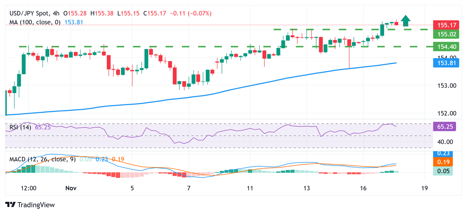 El USD/JPY parece estar preparado para apreciar aún más; un breakout a través de la marca de 155.00 entra en juego